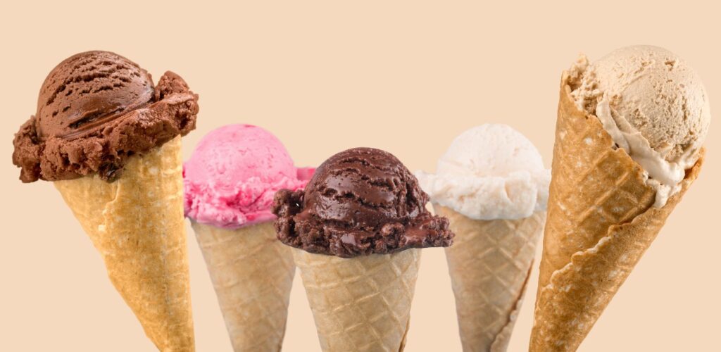 Nocciola, Cioccolato, Pistacchio, Tiramisù, Stracciatella, Caffè, Bacio, Rocher, Nutella, Crema, Zuppa Inglese, Ricotta e pera, Yogurt alla fragola, Variegato all’amarena, Vaniglia, Cassata, Fiordilatte, Croccantino, Panna cotta, Cioccolato Fondente, Yogurt bianco.